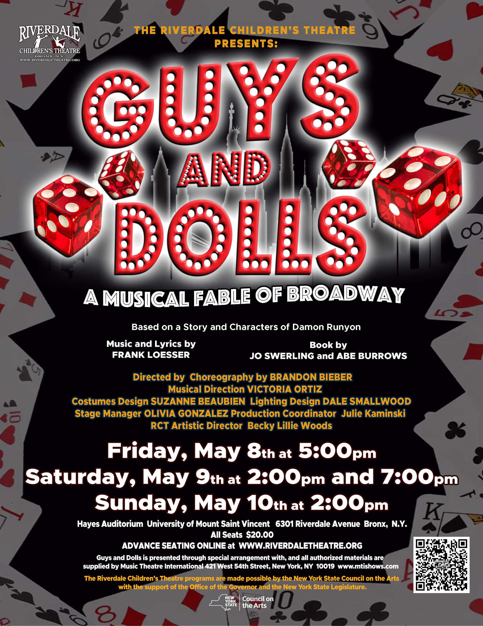 Set in Damon Runyon's mythical New York City, Guys and Dolls is an oddball romantic comedy. Gambler, Nathan Detroit, tries to find the cash to set up the biggest craps game in town while the authorities breathe down his neck; meanwhile, his girlfriend and nightclub performer, Adelaide, laments that they've been engaged for fourteen years. Nathan turns to fellow gambler, Sky Masterson, for the dough, and Sky ends up chasing the straight-laced missionary, Sarah Brown, as a result. Guys and Dolls takes us from the heart of Times Square to the cafes of Havana, Cuba, and even into the sewers of New York City, but eventually everyone ends up right where they belong. Considered by many to be the perfect musical comedy, Guys and Dolls ran for 1,200 performances when it opened on Broadway in 1950. It received nearly unanimous positive reviews from critics and won a bevy of awards, including Tony Awards, Drama Desks and Oliviers.